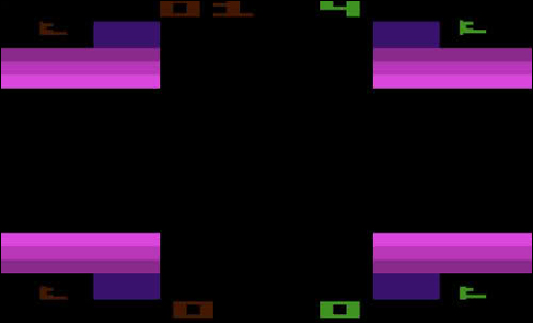 Warlords is the evolution of the early Pong variant Elimination. In it, four players defend their castles from the fireball of a passing dragon. Armed with only a small shield, it is up to you to deflect the danger back at your foes, breaking down their defenses until you are the last one standing.