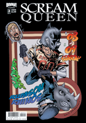 Okay, we'll start with the story. Wrighty, the psycho in the rhino costume, is showing his love for Molly by following her around and hacking up anyone who either makes her life unpleasant, or gives off any kind of vibe that they might want to ask her out. Because as Wrighty says, "No. Other. Boy. Friends." As masked killers go, Wrighty talks to himself an awful lot, but it tends to run along the lines of "Why Molly no like me? No other boyfriends but me! Aargh! Giant rhino head no fit through door! Wrighty smash!" Okay, that last one was mine. I don't know if this is supposed to be a straight up slasher pic in comic book format, or a send-up of a straight up slasher pic in comic book format. It's totally absurd, but so was Chopping Mall. It's not particularly funny, but neither was Scream 3. You can understand my dilemma here. Brendan Hay, a staff writer for The Daily Show, has written a script that takes all the clichés of the slasher genre, starts to turn them on their heads, but then continues to turn until they're all right-side up again. He then leaves them there, and you have to wonder what all the effort was for.